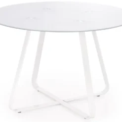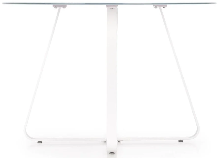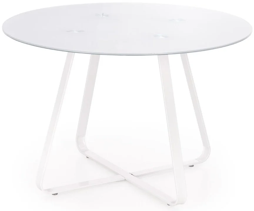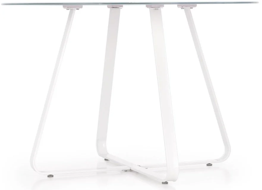 Ett mysigt matbord med en modern design. Bordsskivan är tillverkat av vitfärgat glas och underredet är av pulverlackerad vit metall.