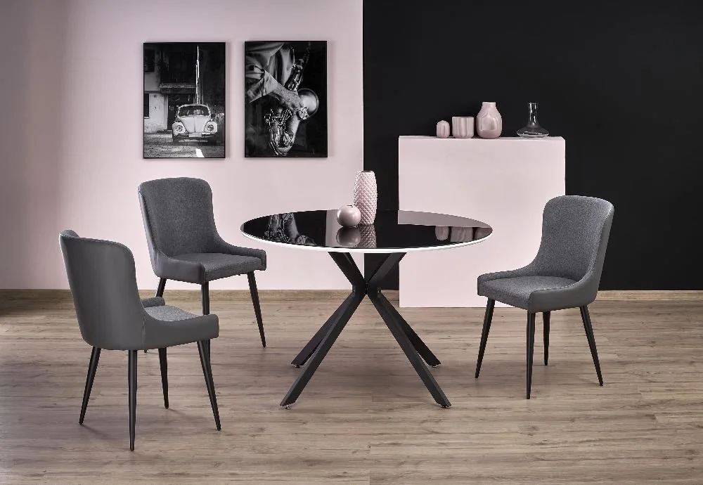Ett härligt matbord med en modern design. Bordsskivan är tillverkad av lackerad MFP (premium träskiva) med en toppskiva i svart tåligt glas och underredet är av pulverlackerad metall.