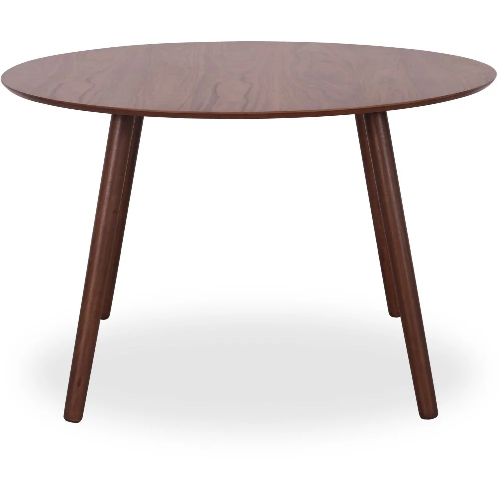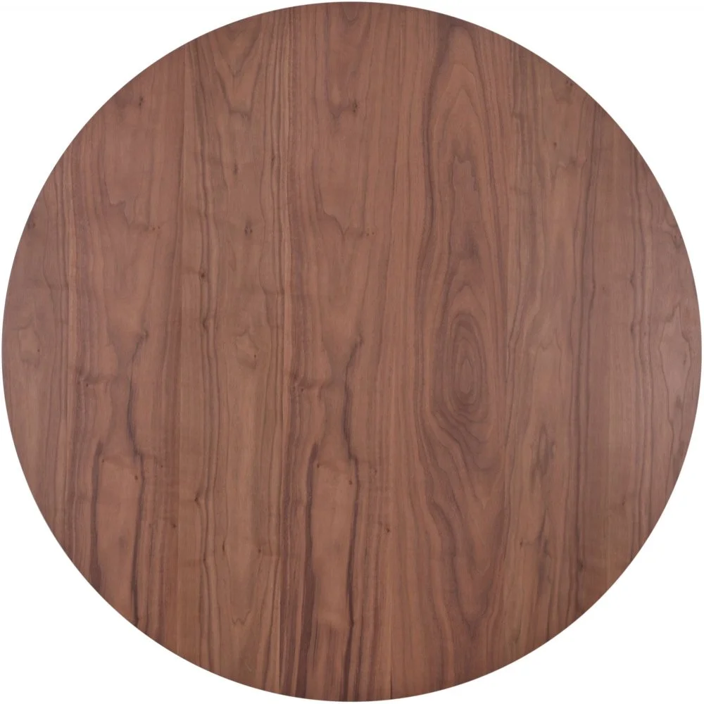 Ett runt matbord i valnötsfaner med tidsenliga runda ben. Detta bord passar in i de flesta miljöer med sitt stilrena formspråk.