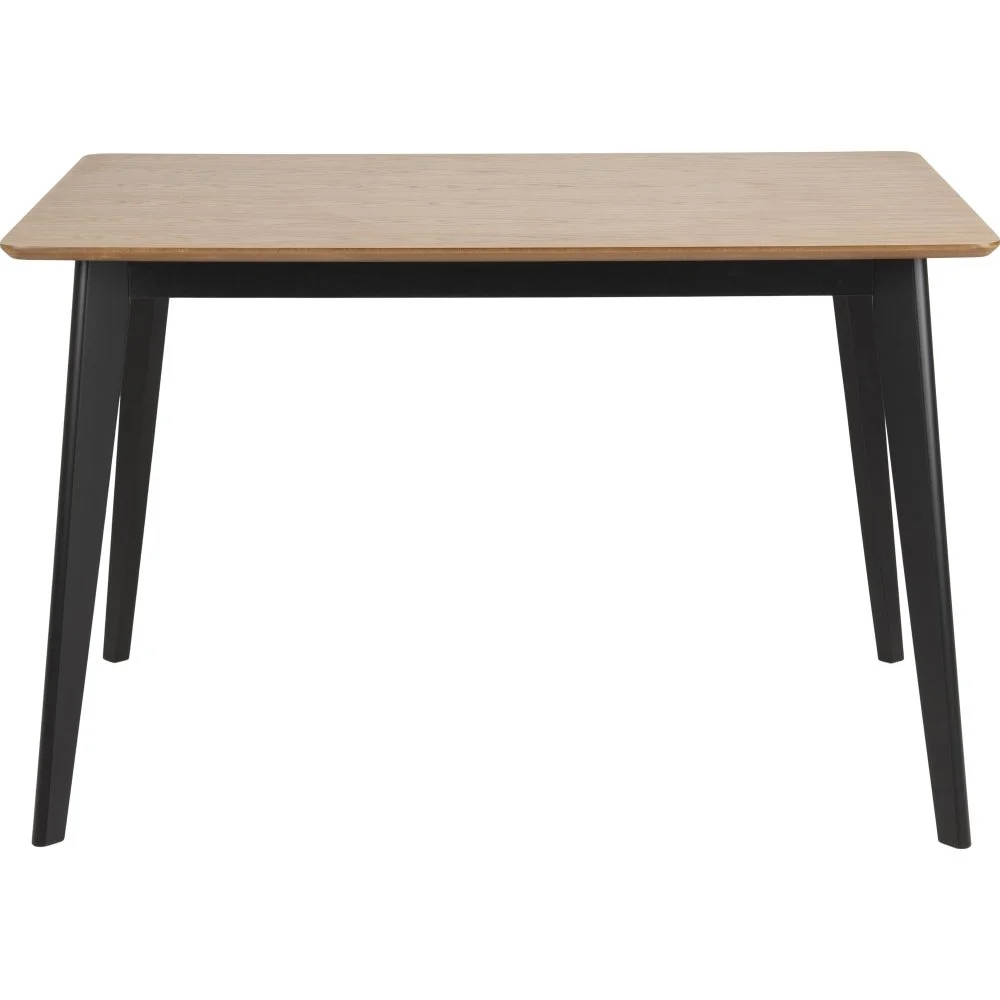 Matbord med ben av lackerad gummiträ. Bordsskiva av lackerad ekfaner och MDF.