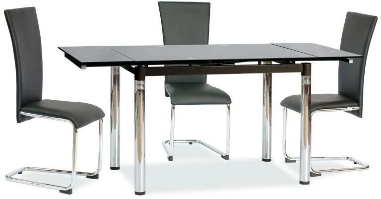 Ett fint matbord med en modern design. Underredet är tillverkat av kromad metall och bordsskivan är av mycket hållbart härdat glas i svart. Bordet är praktiskt då du lätt kan förlänga det från 110 cm till 170 cm. Tilläggsskiva ingår.