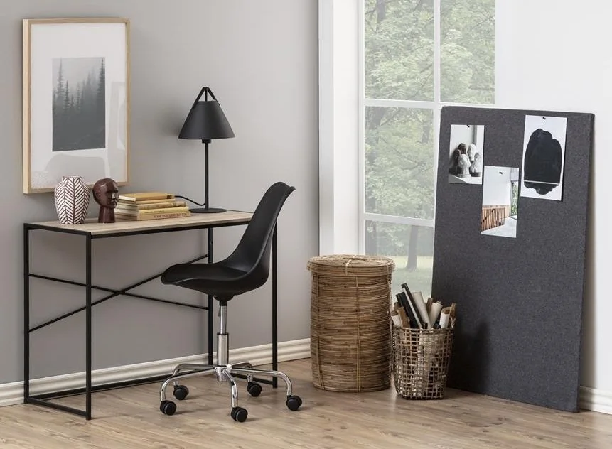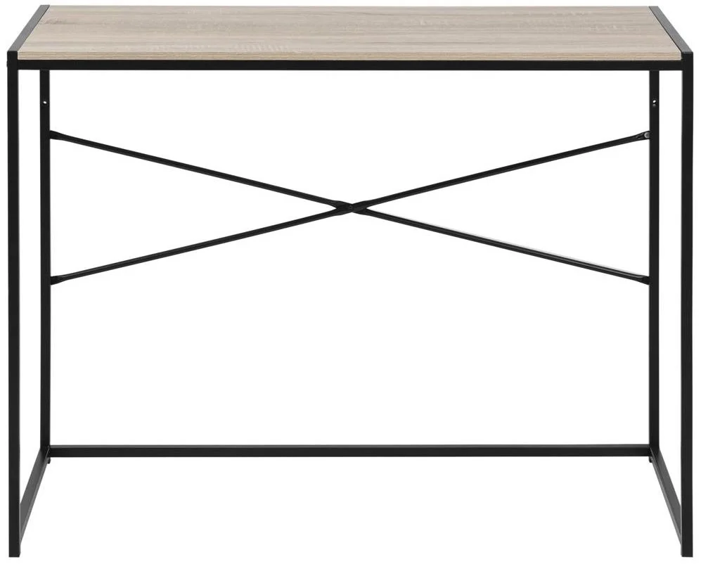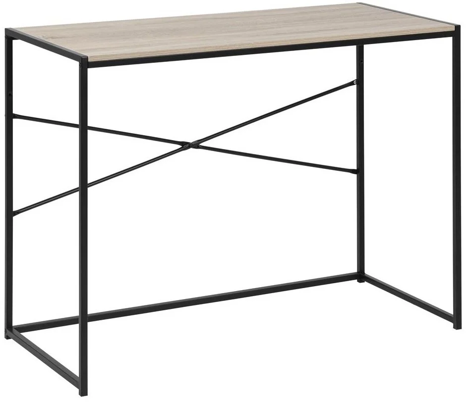 Ett mysigt skrivbord med en stilren design. Underredet är tillverkat i pulverlackerad svart metall och bordsskivan är av trä med en härlig sonoma ekimitation. Skrivbordet passar perfekt in i flera olika miljöer och är lätt att kombinera med en skön kontorsstol.