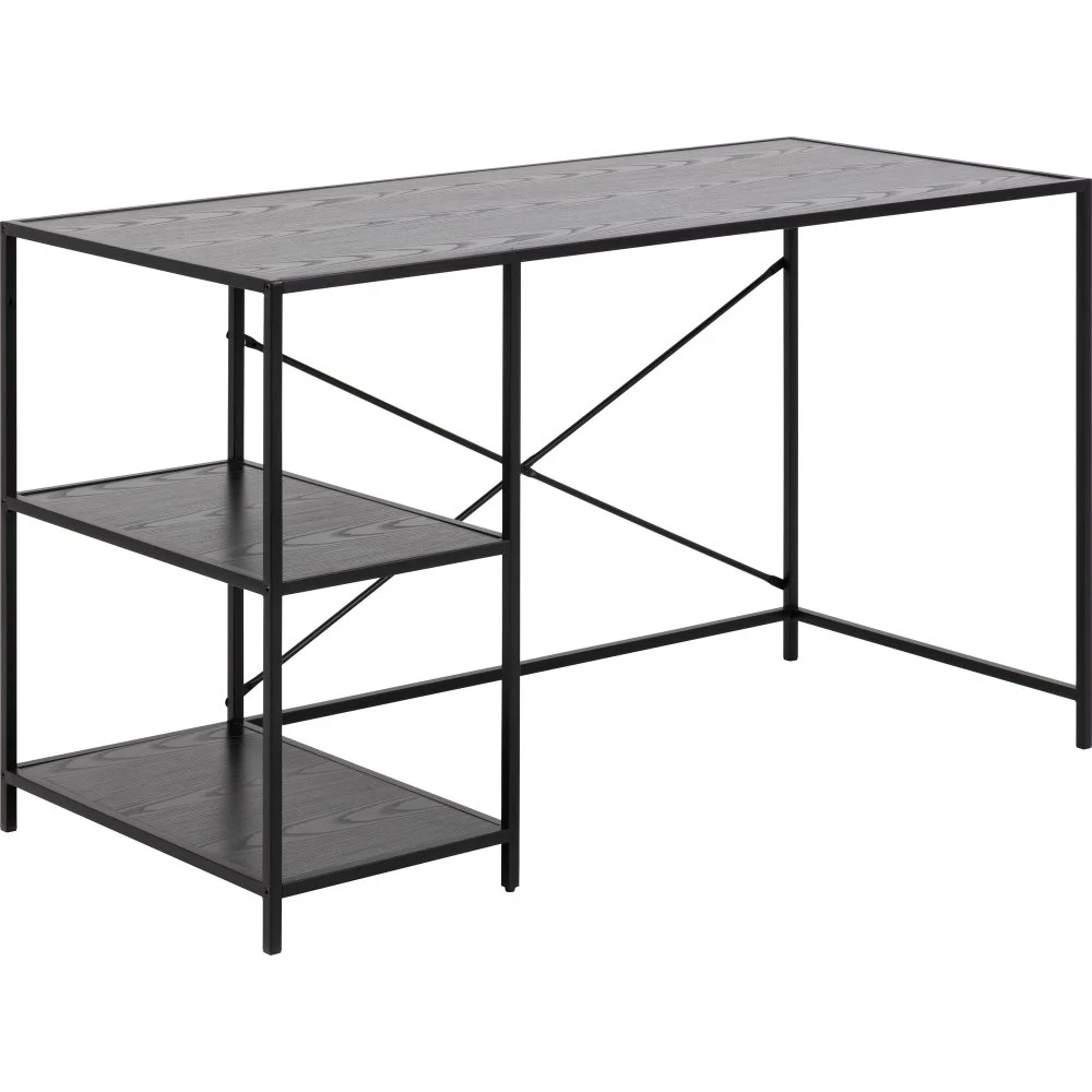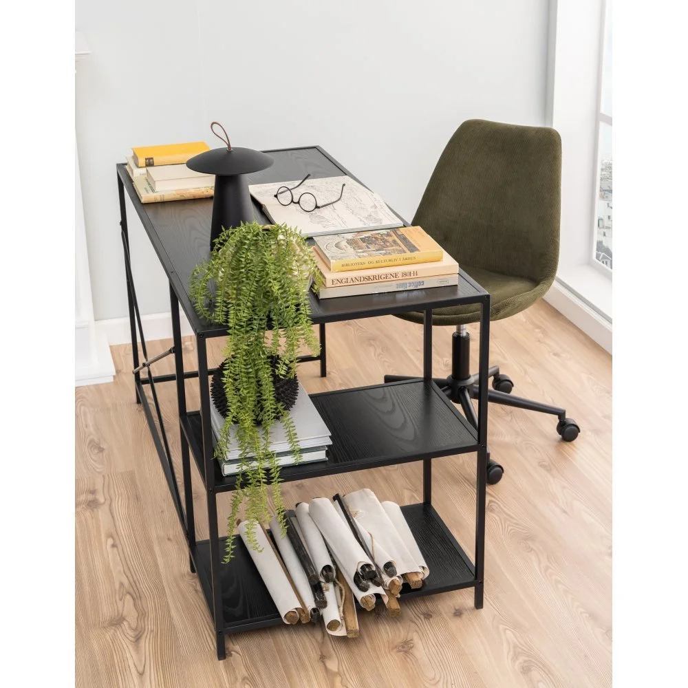 Skrivbord med ben av pulverlackerad metall. Bordsskiva av melamin och MDF.