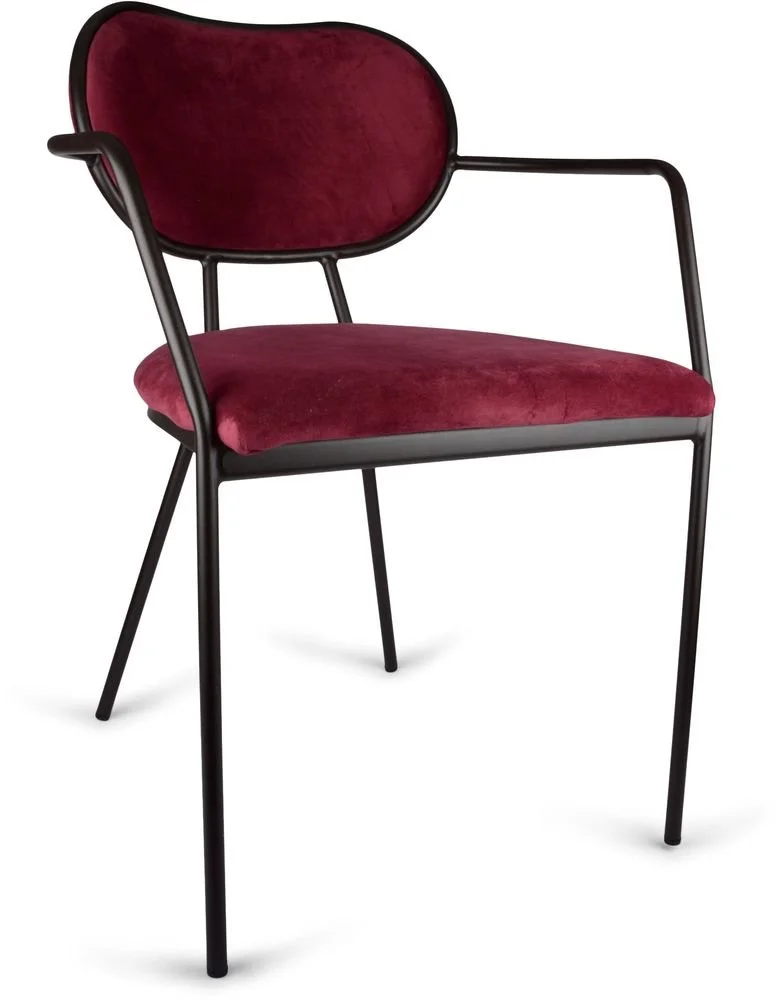En lyxig stol med en tidlös design. Underredet är tillverkat i svartlackerad metall och en mycket behagligt sits i vinrött sammet tyg.