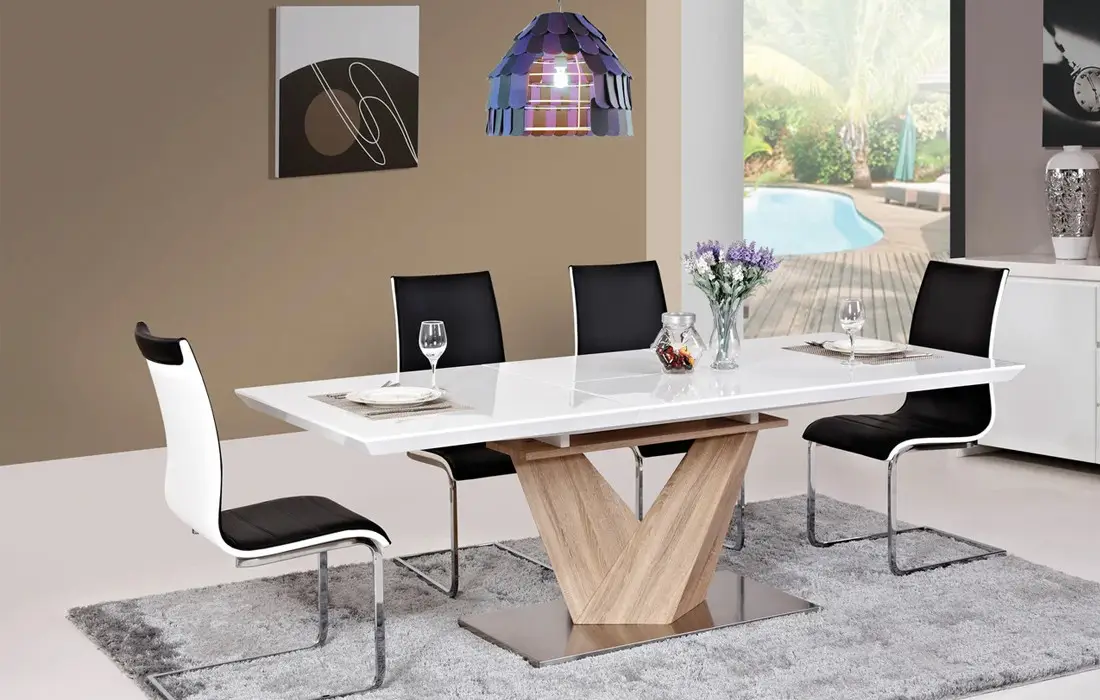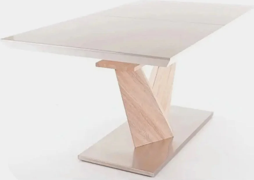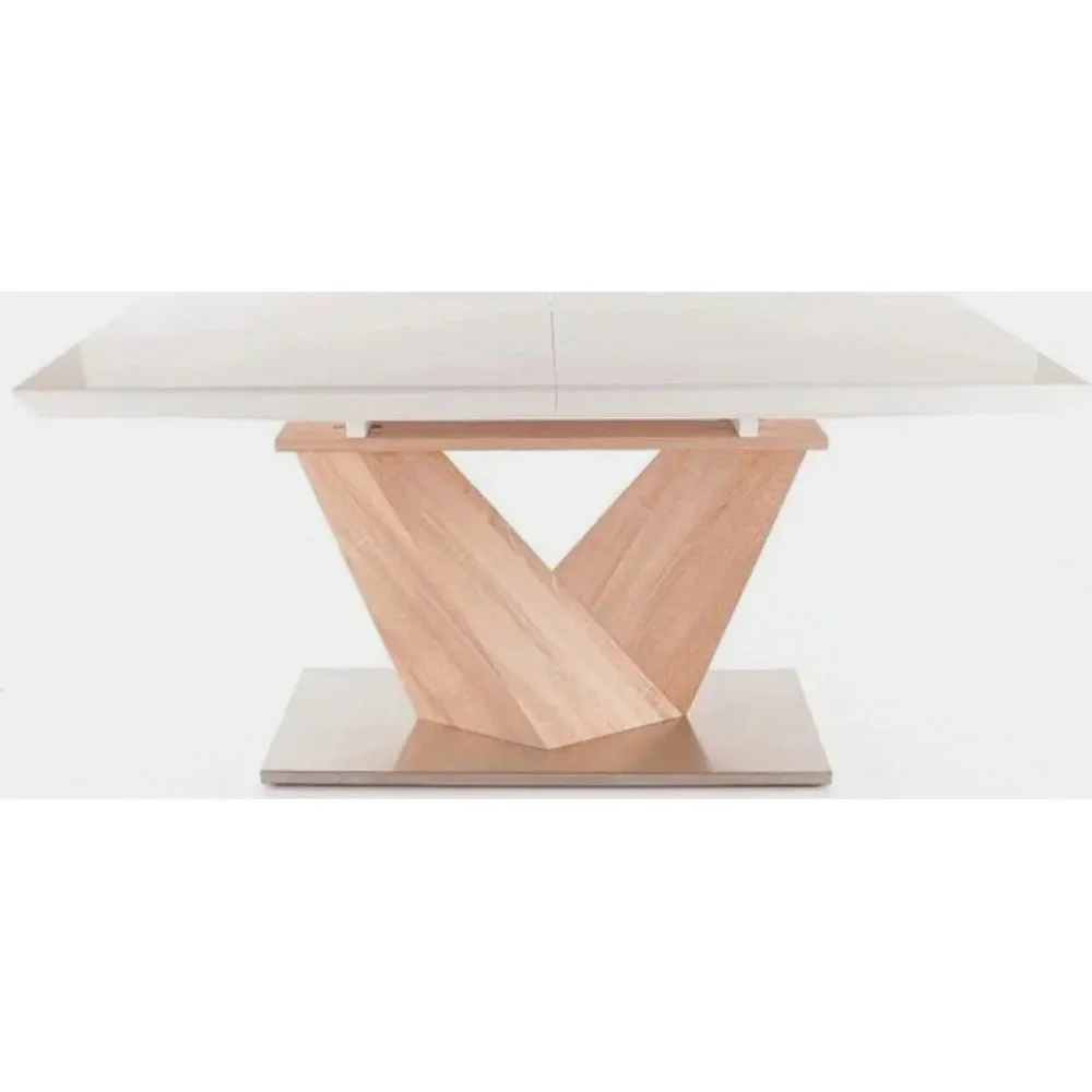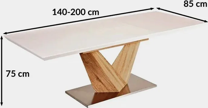 Ett snyggt matbord med en modern design. Bottenplattan är tillverkad av borstad stål och basen är av MDF med ett härlig sonoma ek utförande. Bordsskivan är av vitlackerad MDF. Bordet är praktiskt då du lätt kan förlänga det från 140 cm till 200 cm. Tilläggsskiva ingår.