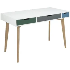 Ett härligt skrivbord med en lite simplare design med benen är gjorda av mycket fint massiv ek. Själva bordsskivan är vitmålad och lackad och där är tre lådor för förvaring. Lådorna är färgade med grön, grå och ljusblå färg, som gör att skrivbordet verkligen sticker ut lite extra.