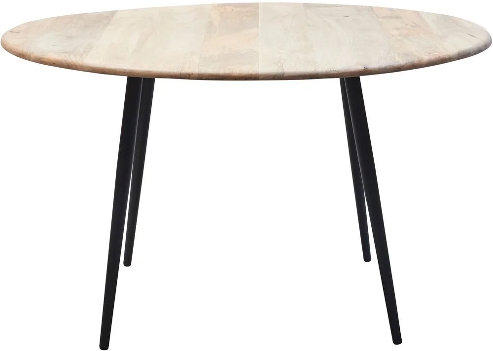 Runt matbord med toppskiva av mangoträd och svarta runda ben av metall.