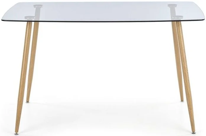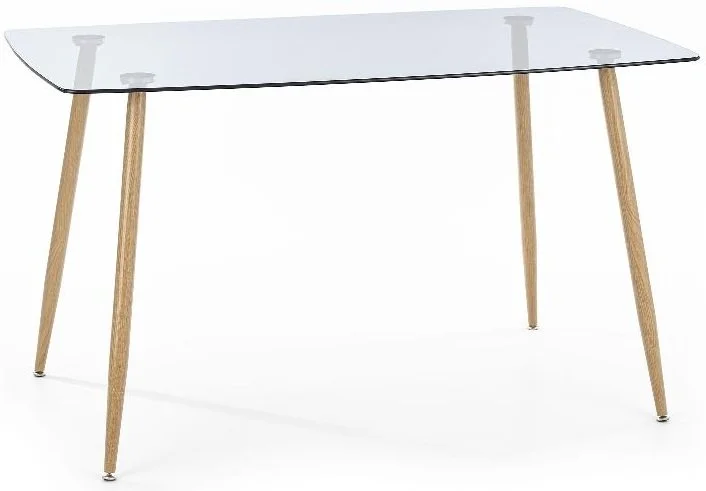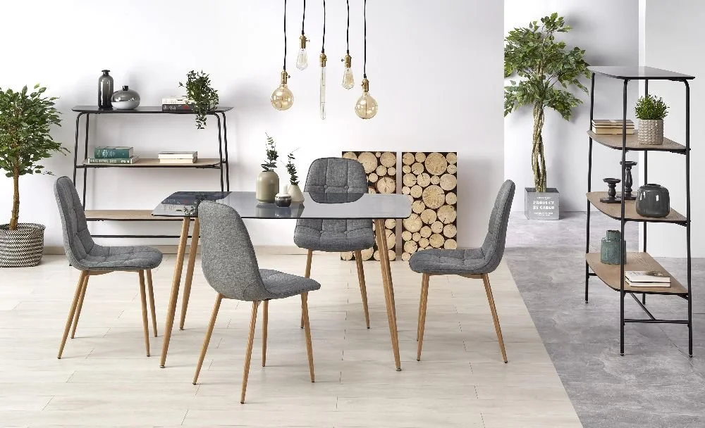 Ett snyggt matbord med en stilren design. Bordsskivan är tillverkad av mycket tåligt rökfärgat glas och underredet är av ekfolierad metall med en snygg trä look.