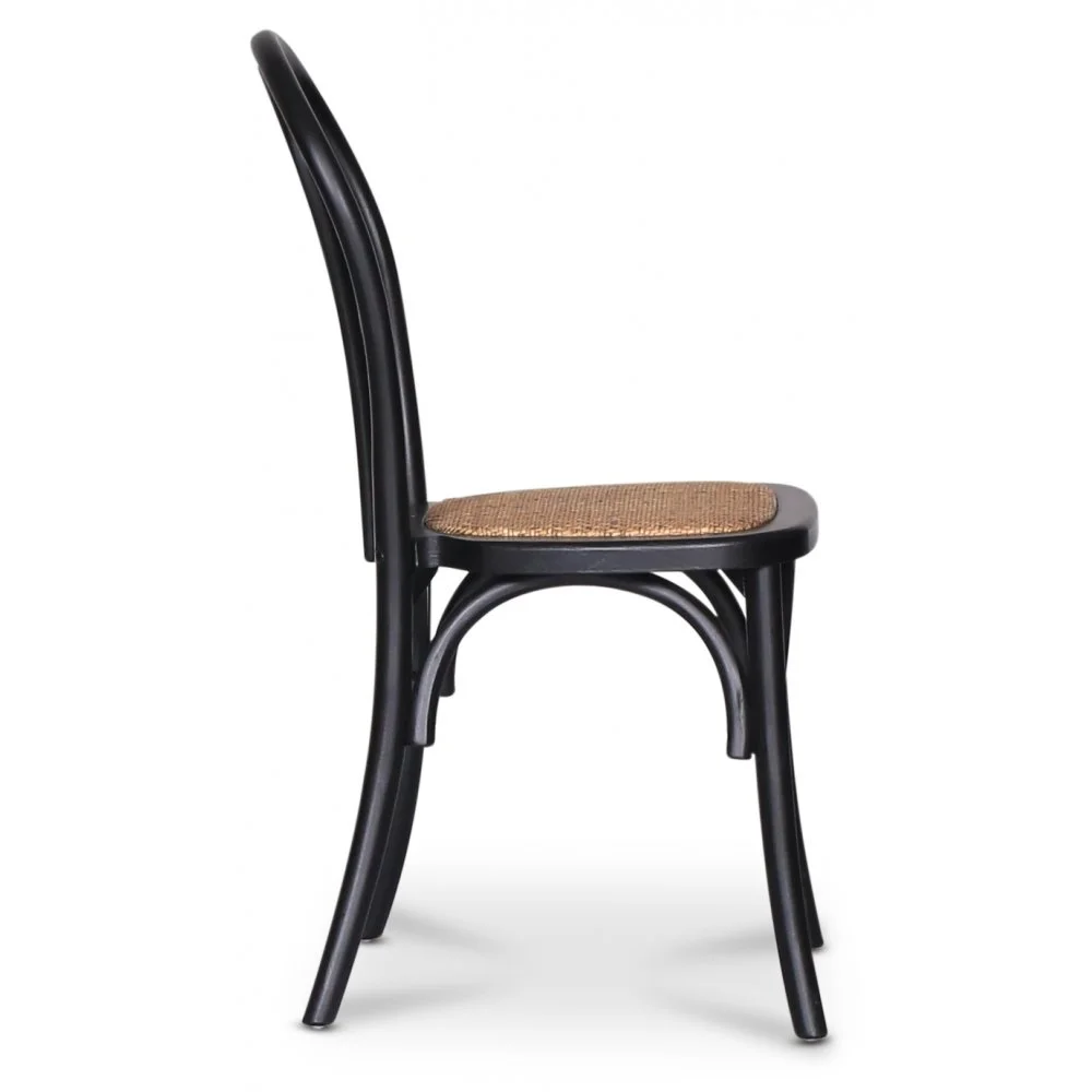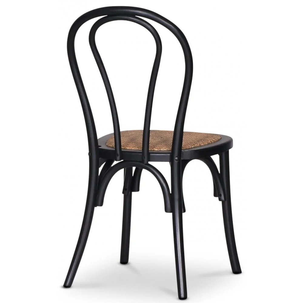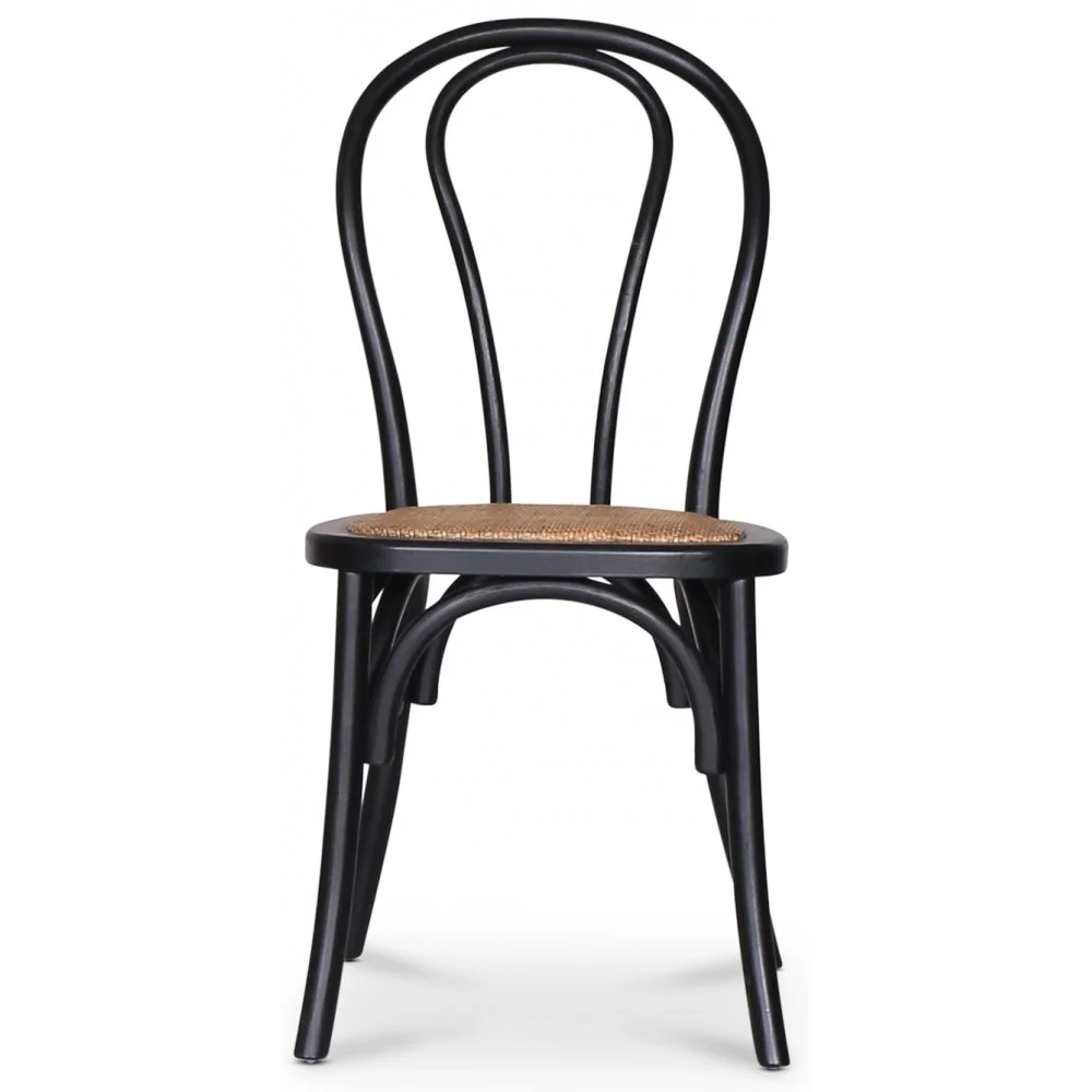 Stol med stomme av svart massiv bok och sits av antikfärgad rotting. Teknik för att böja träet har använts i designen. En stilig stol i neutrala färger, kombinera gärna med ett passande matbord.