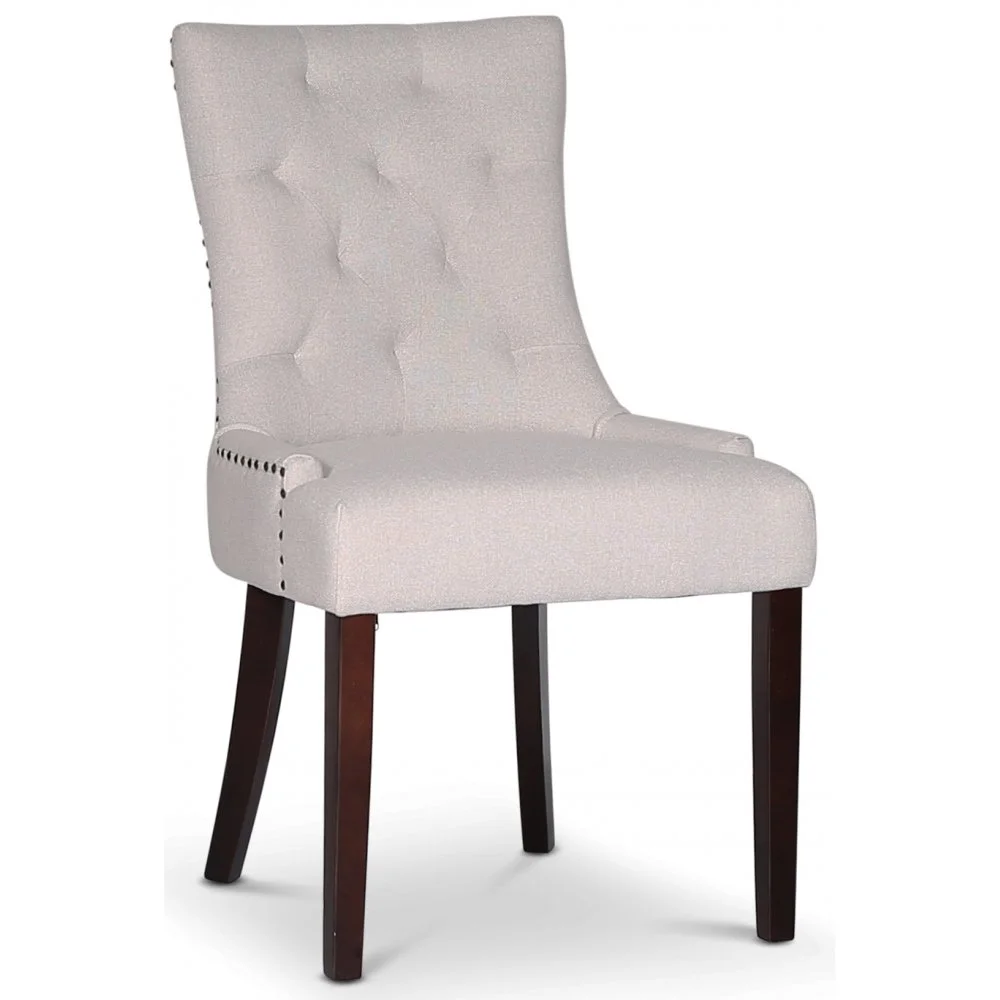 Tuva, en stol i beige tyg med antikfärgade nitar som snygg detalj. De bruna benen matchar Lamier matbord perfekt. Stolen är välarbetad och en av våra mest populära matstolar.