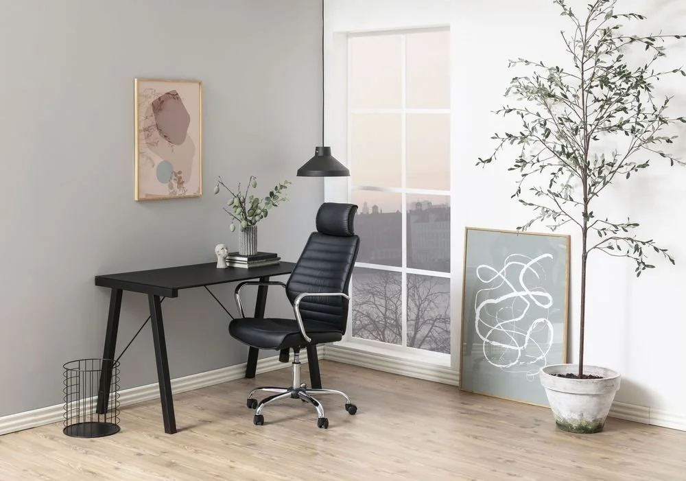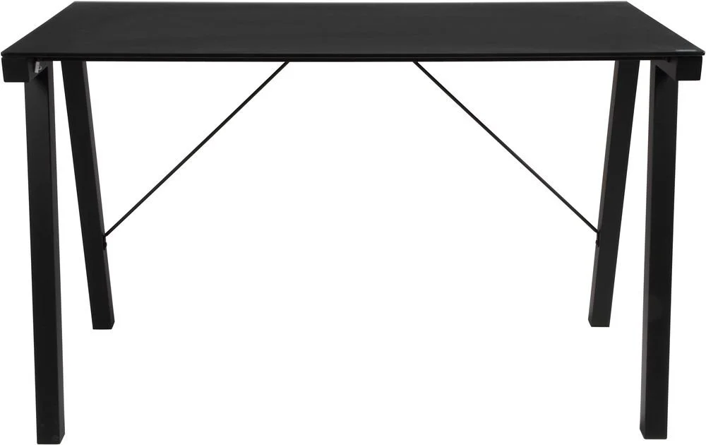 Skrivbord med underredet tillverkat i svartlackerad metall och bordsskiva av svart 8 mm rep-resident glas.