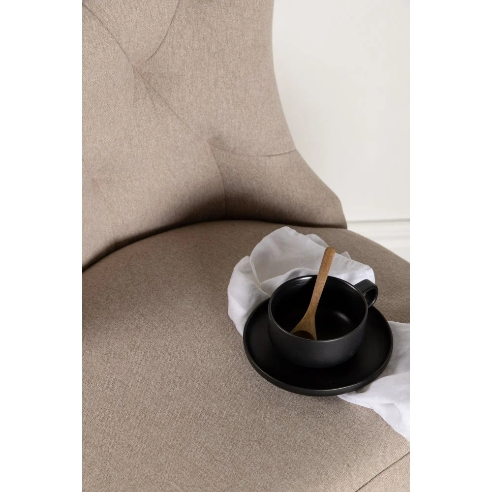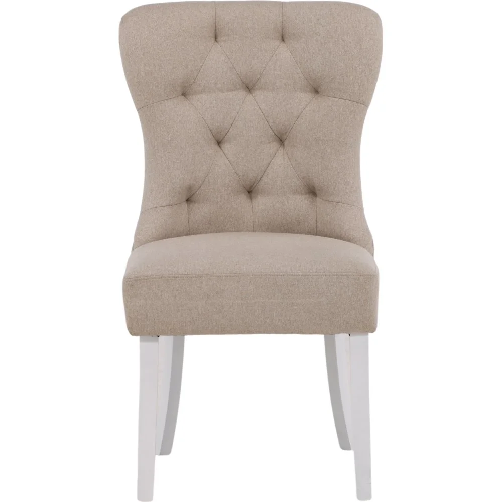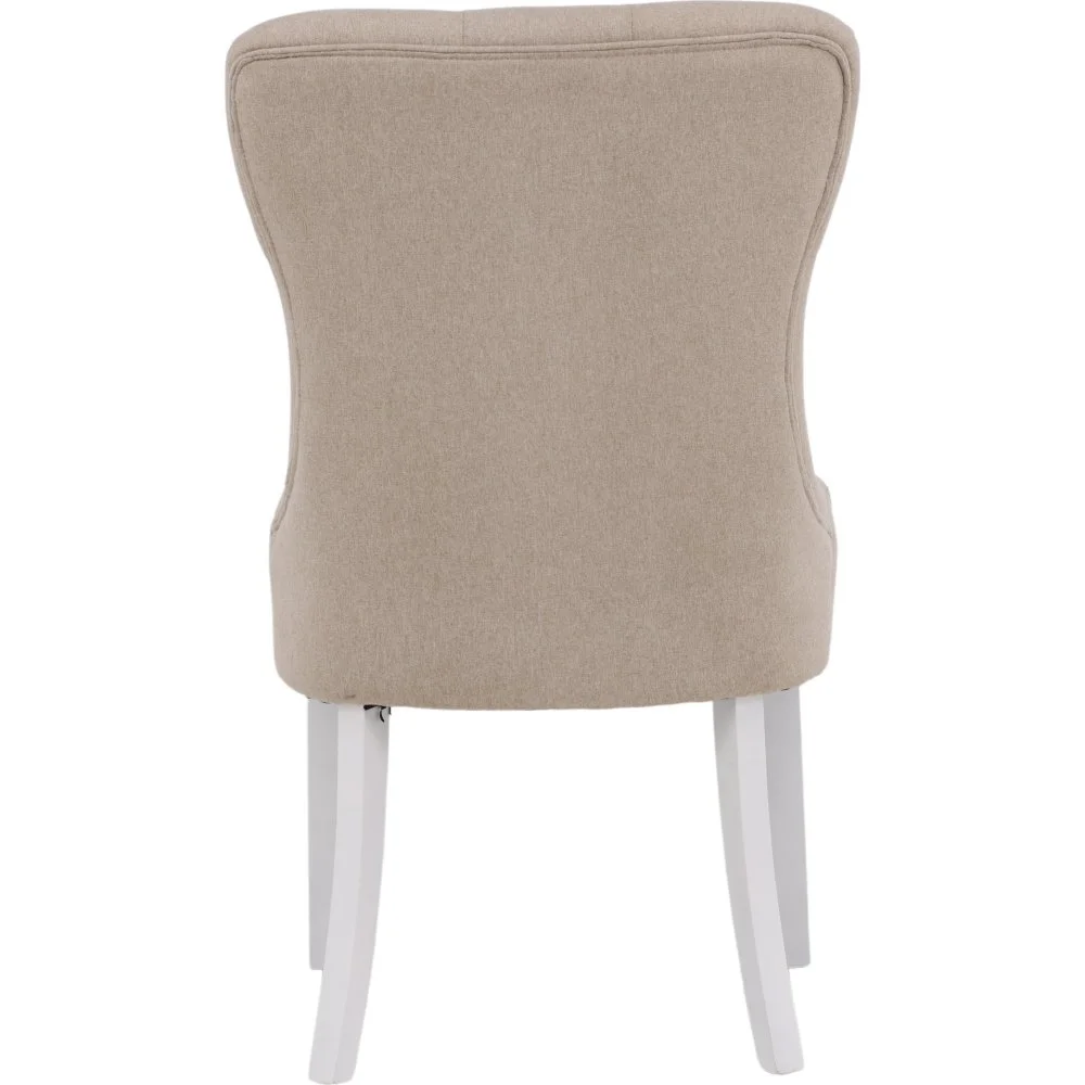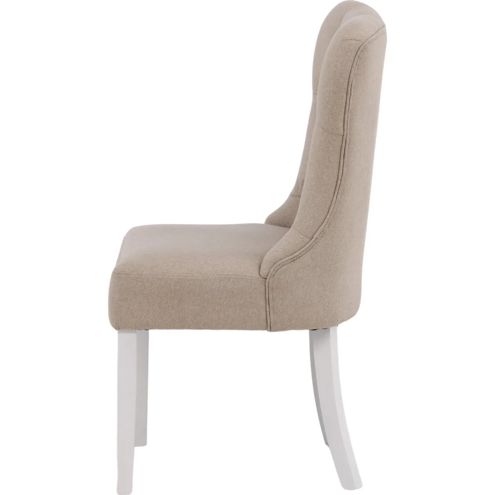 Matstol som är lika bekväm som stilren. Den här matstolen har en pampig, skandinavisk design med en helklädd sits i beige linnetyg med djuphäftade knappar i ryggen och vita stolsben i trä. Lika slitstark som iögonfallande bjuder den här matstolen in dig till långa, trivsamma stunder kring matbordet.