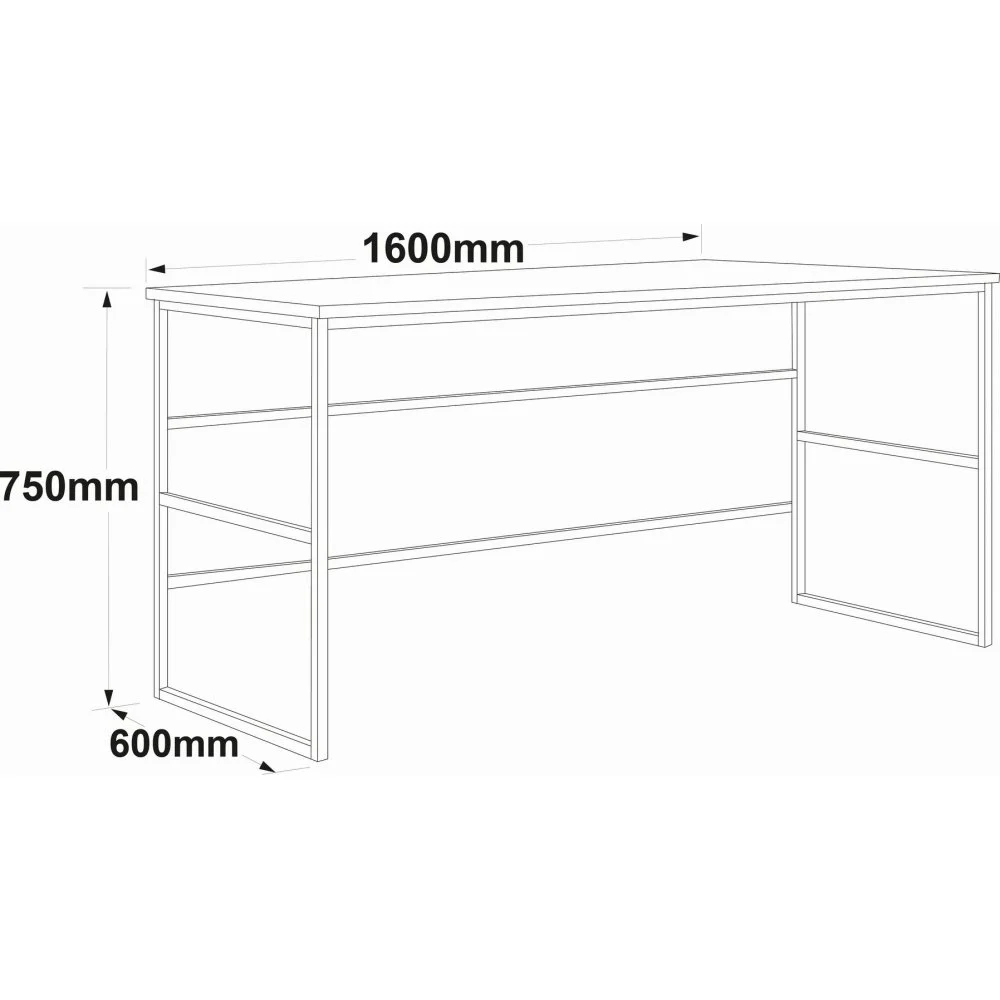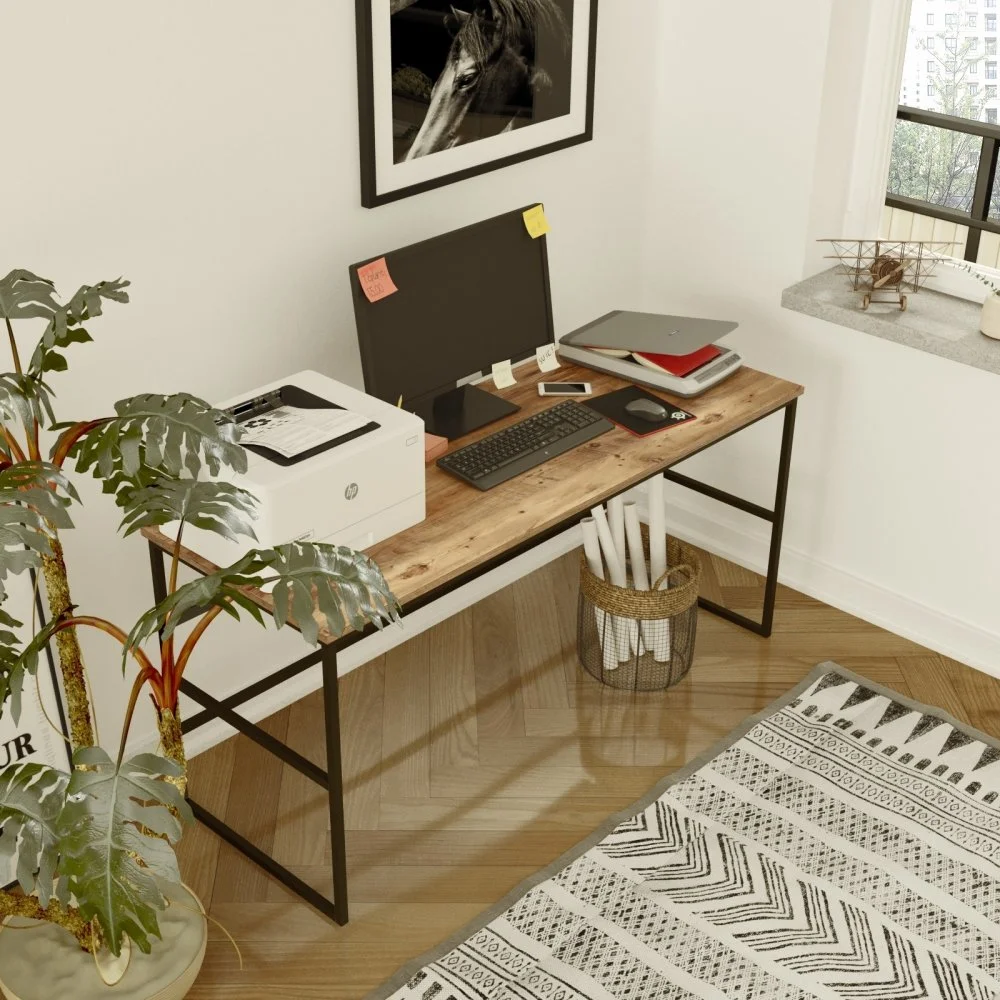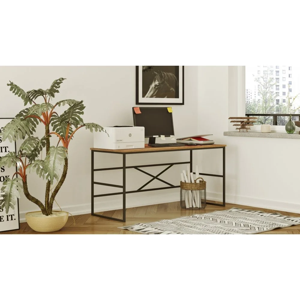 Skrivbord av trä och metall.