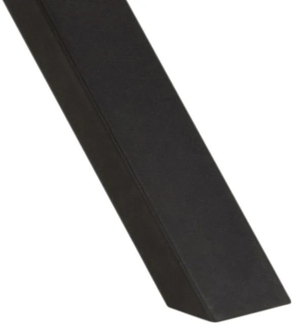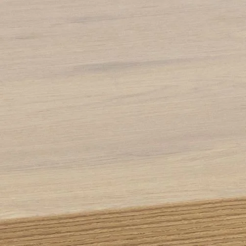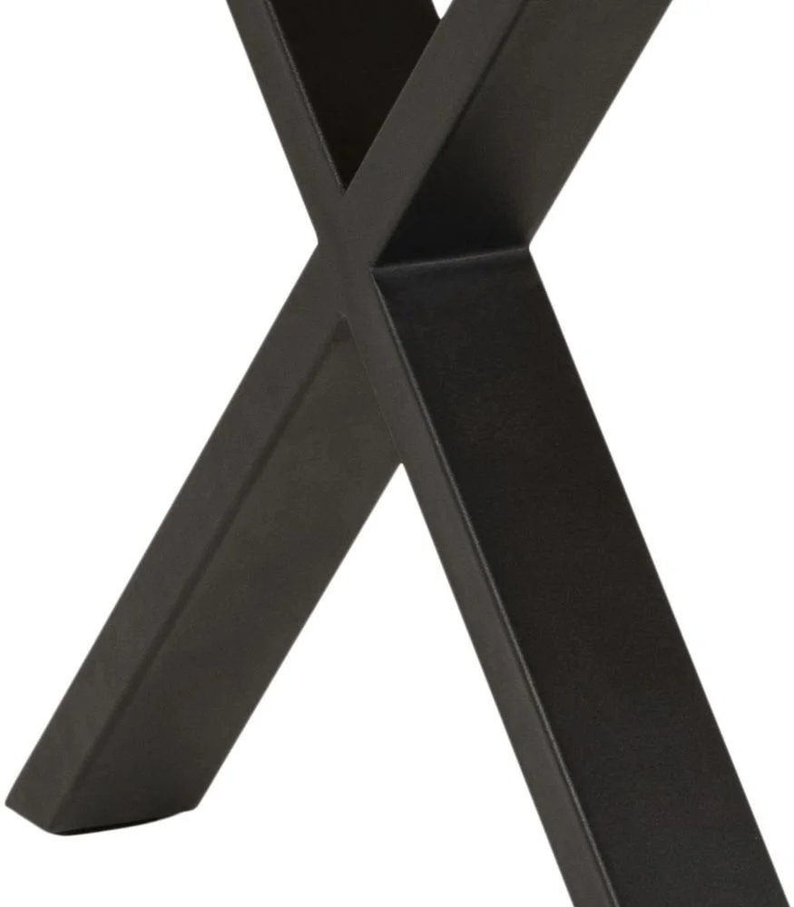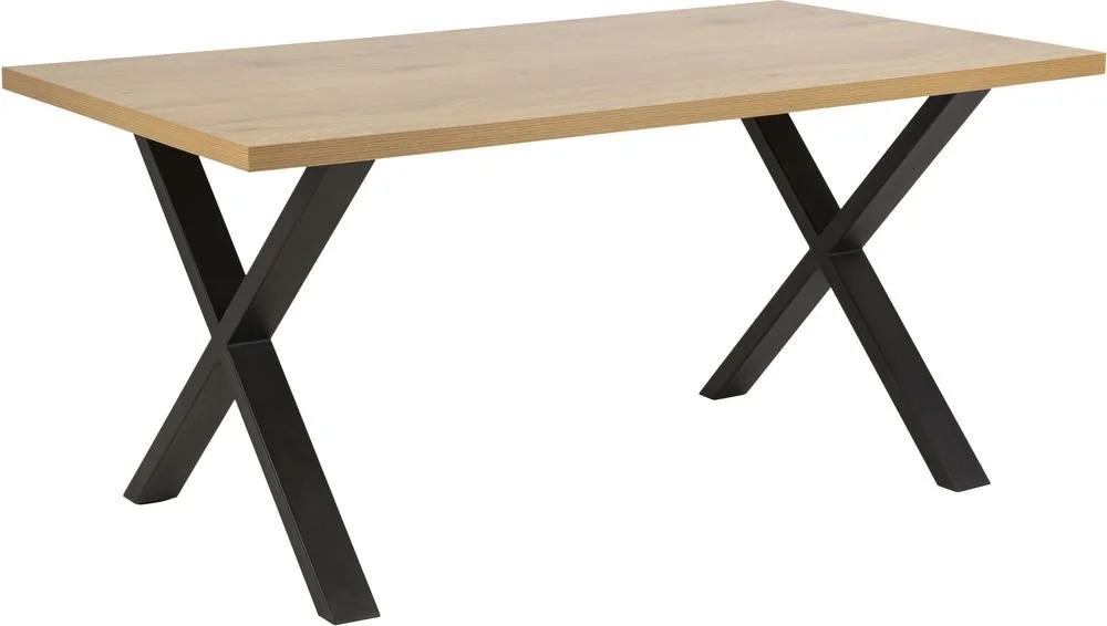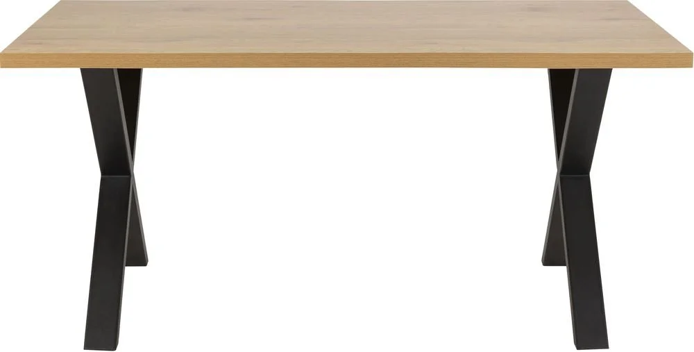 Matbord med bordsskiva tillverkad av melamin med ek-imitation. Underredet är tillverkat av svart pulverlackerad metall.