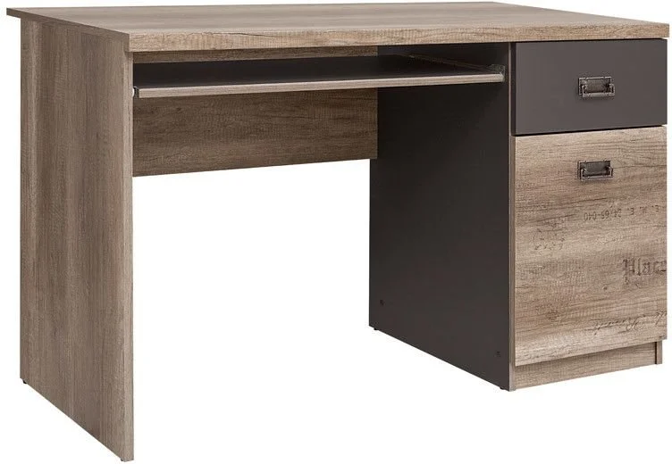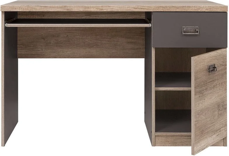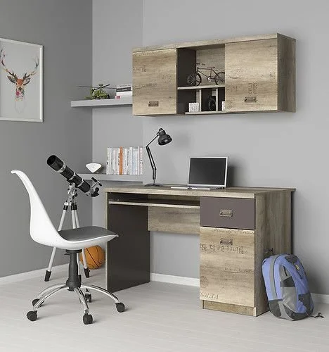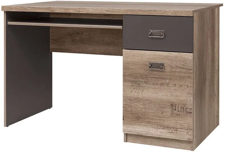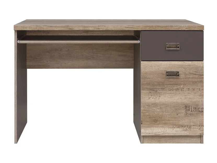 Ett fint skrivbord i ek och en lådfront i grått med dekorativa handtag. Undertill finns en vågrät skiva som skyddar väggen mot smuts men hjälper också till att stabilisera skrivbordet. Med tangentbordshyllan slipper man ha onödiga prylar uppe på bordet. I lådan och skåpet finns det möjlighet att förvara saker man behöver ha i anslutning till skrivbordet. Som en fin detalj finns det diskreta grafiska ord och siffror på möblerna som en röd tråd genom hela möbelserien.