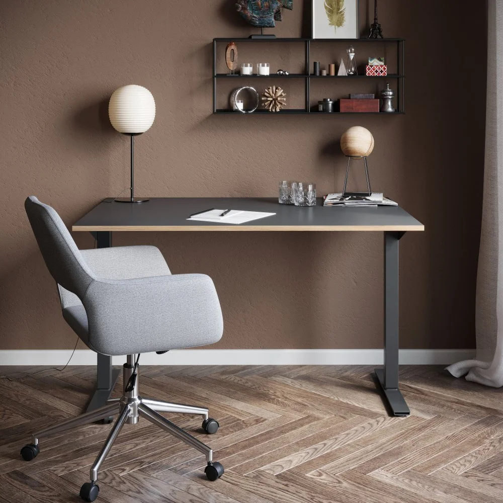 Wedge är ett praktiskt höj- och sänkbart elektriskt skrivbord. Toppskiva av reptålig och hållbar högtryckslaminat, robust svensktillverkat underrede av metall, tillverkat i Sverige. Toppskivan har en massiv eklist, för att ge kontrast till det svarta. Justerbara fötter. Detta skrivbord finns även i vitt utförande.