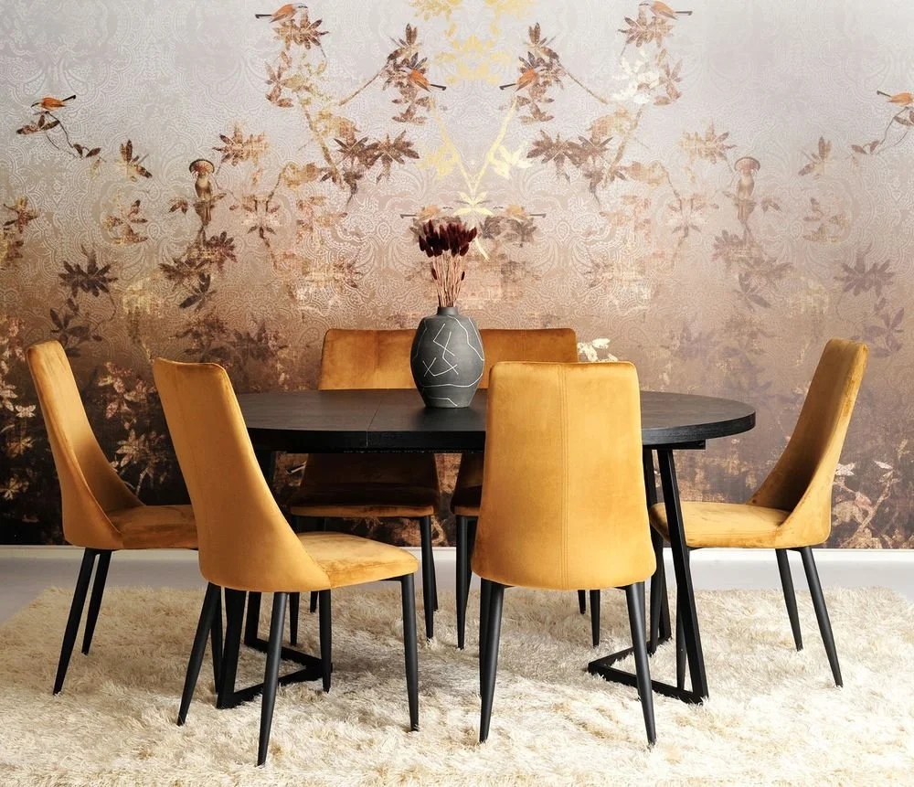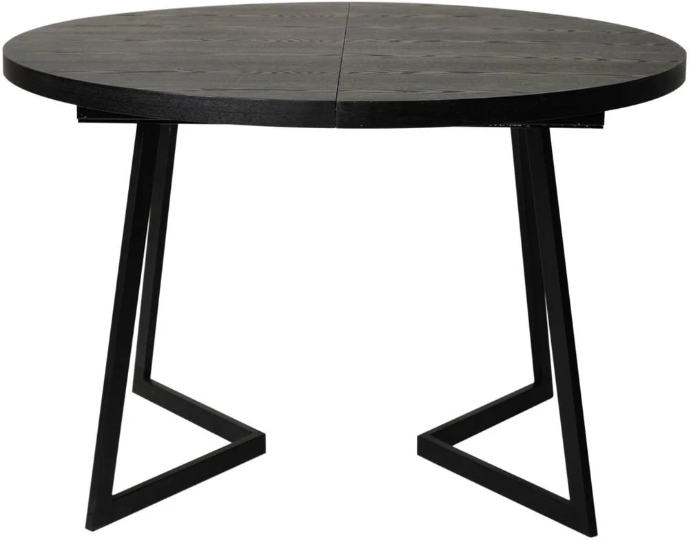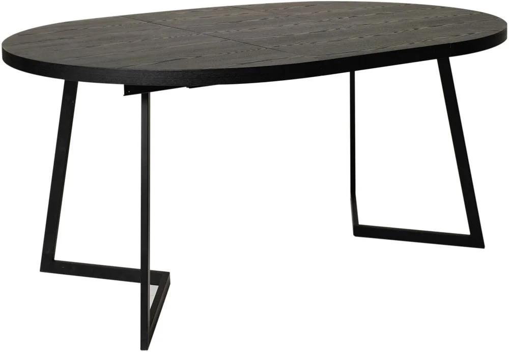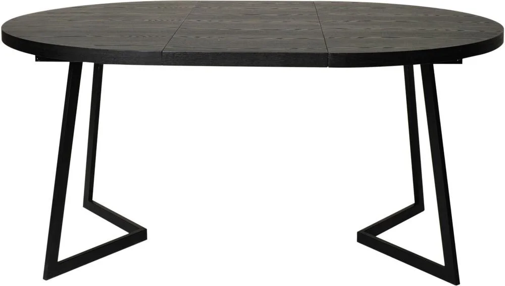 Modernt runt matbord med toppskiva av askfanér och svarta metallben. 120 cm i diameter kan förlängas till 165 cm längd och 120 cm djupt.